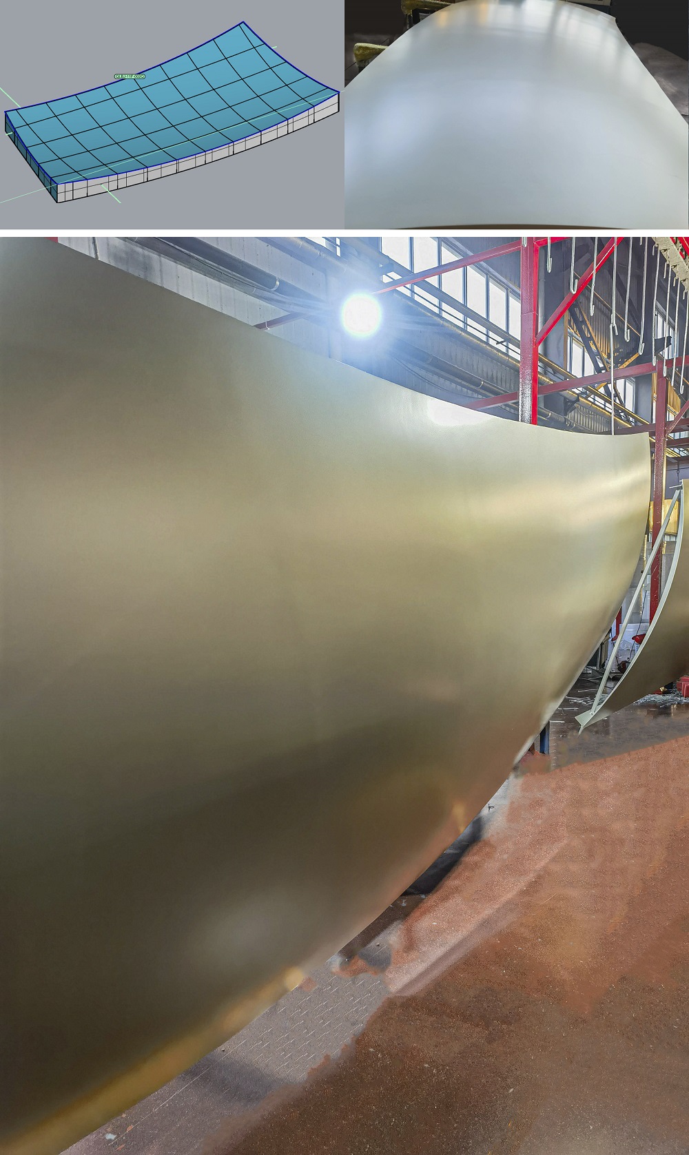 值得一提是的主樓八根香檳色鋁板巨型角柱,該工藝為鋁幕墻制造工藝中最復(fù)雜的雙曲,每根柱子由54個雙曲單體構(gòu)成,每個單體面積約8平方,雙曲面經(jīng)過工匠們精心打磨,才成就流暢的單元體線條。難度最大的是,所有拼成柱體的板件尺寸大多為特大1800*6000mm異型板,采用單元板式設(shè)計,每件板超寬、超長,單件板重達(dá)130kg,相當(dāng)于2個成年人的重量。每次鈑金、轉(zhuǎn)序、從噴涂隧道順利噴漆完成,都十分的小心,傾注雅泰所有操作者的心血。
