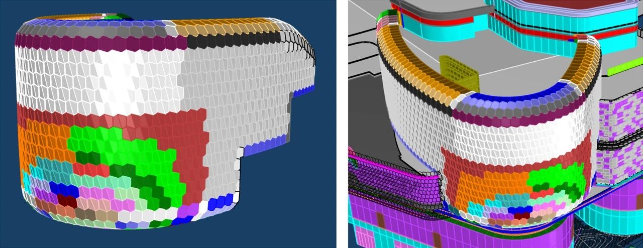南裙樓船頭造型內(nèi)部鋼結(jié)構(gòu)均有扭轉(zhuǎn),要求拐角幕墻呈現(xiàn)雙曲面效果;屋檐幕墻設(shè)計(jì)圍繞龍鱗造型,分解為單片“六邊形”元素展開(kāi),拐角弧度造型對(duì)鋁板制造及安裝工藝要求極高。